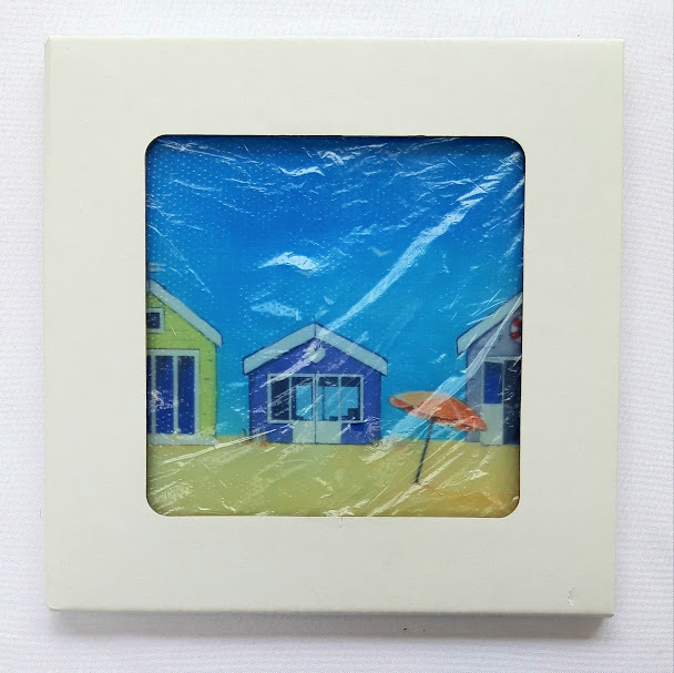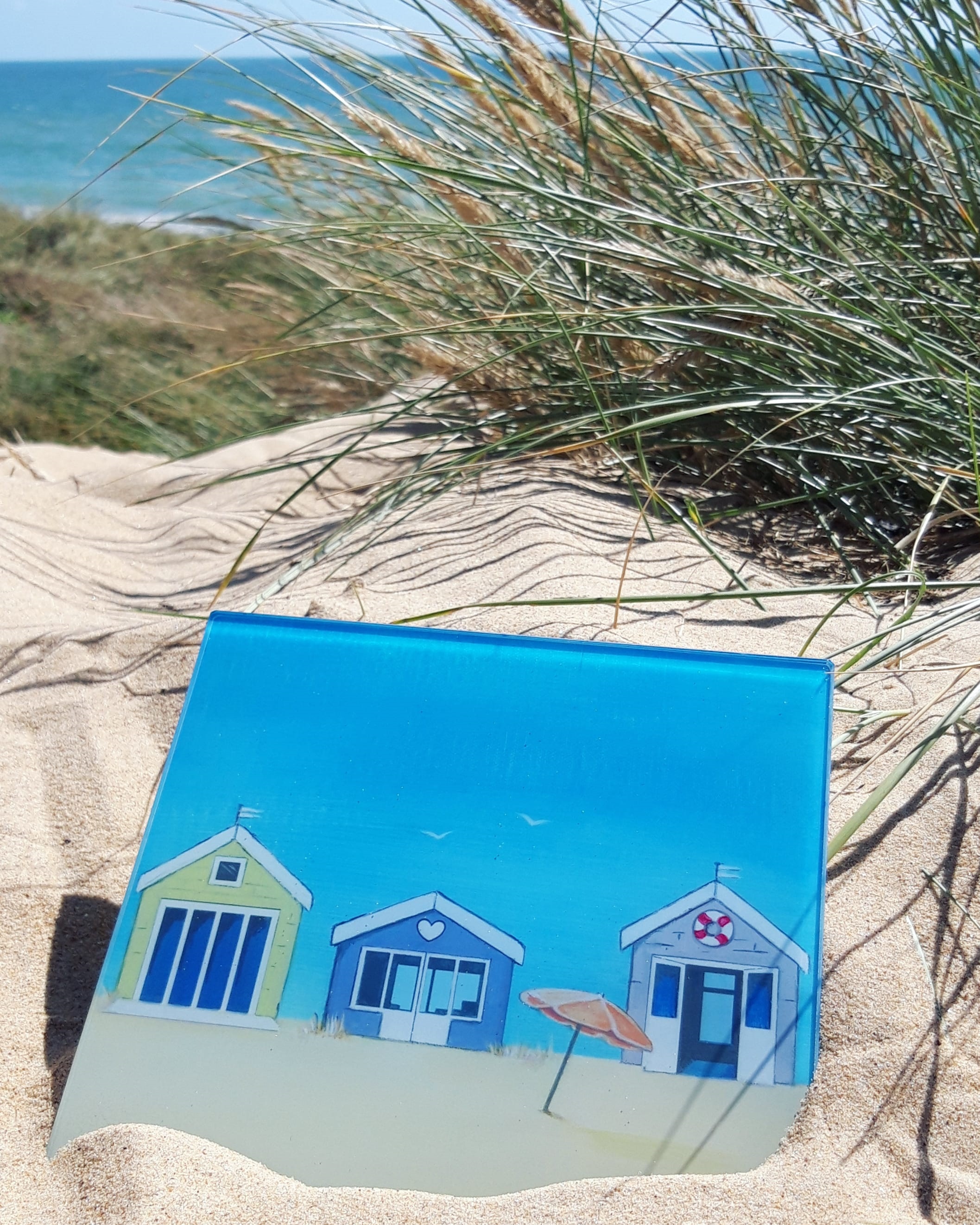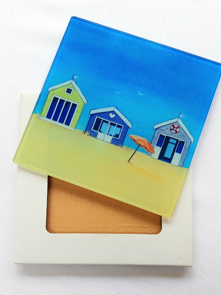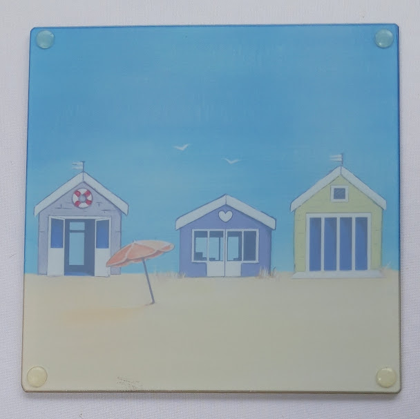 This smooth glass worktop saver has a wonderful Beach Hut design taken from an original painting called "Endless Summer" by Loz Walters.