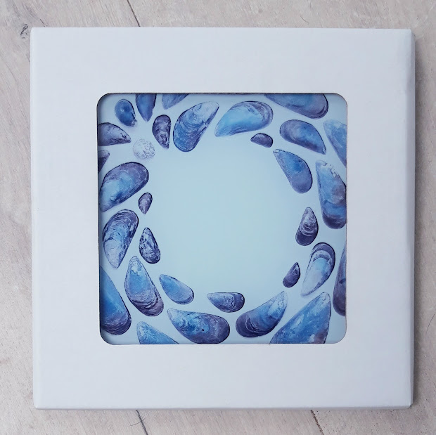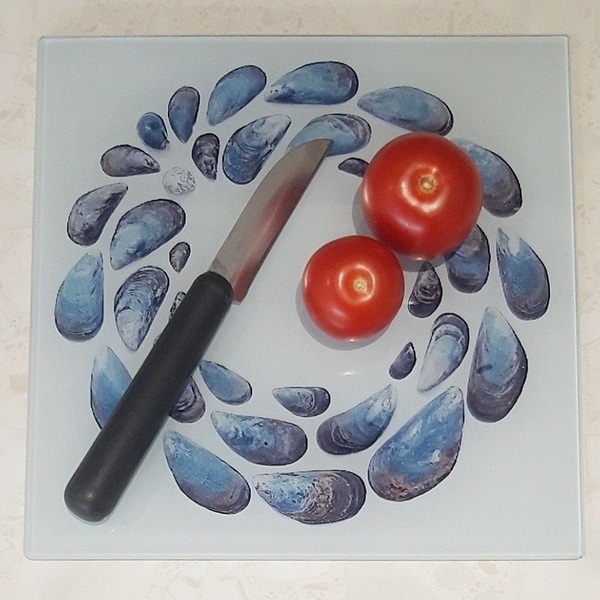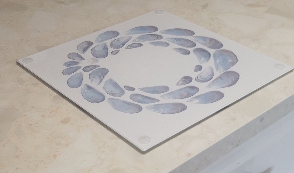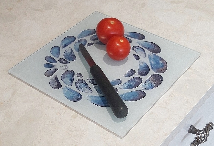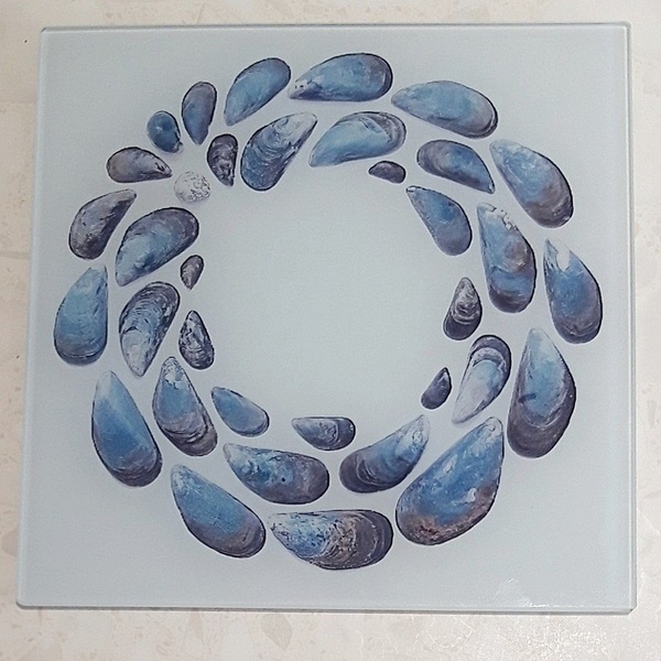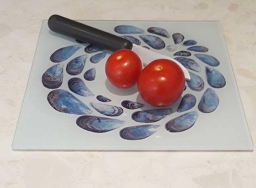 This smooth glass worktop saver has a wonderful Mussel-shell design from original artwork by Loz Walters.