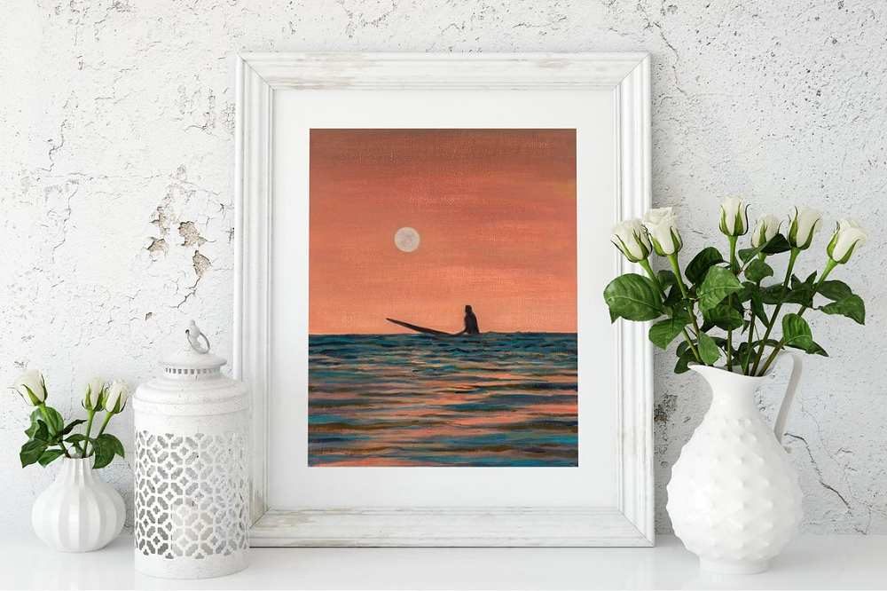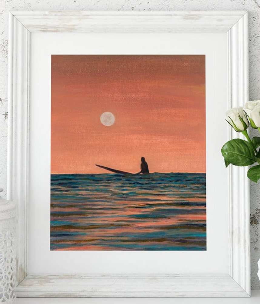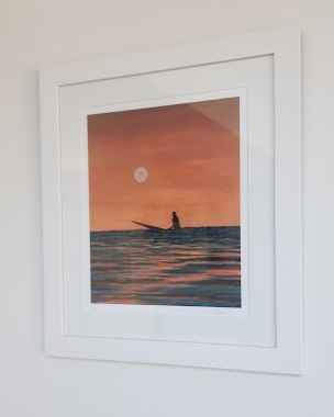 Limited Edition giclée print of a surfer on the ocean at sunset with the moon rising. Perfect for Ocean Lovers, surfers, paddleboarders and those who seek the solitude of the ocean.